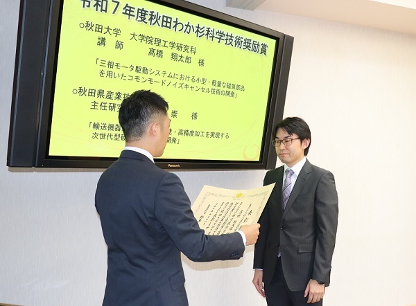 社会システム工学科 電気システムコース 髙橋 翔太郎 講師が令和7年度秋田わか杉科学技術奨励賞を受賞しました。