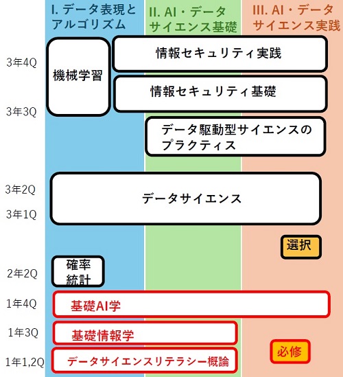 「データサイエンスリテラシー概論」、「基礎情報学」、「基礎A I学」(各1単位)の計3単位を必修科目とし、「確率統計」、「データサイエンス」、「機械学習」(各2単位)、「情報セキュリティ基礎」、「情報セキュリティ実践」、「データ駆動型サイエンスのプラクティス」(各1単位)から4単位以上を履修すること。
