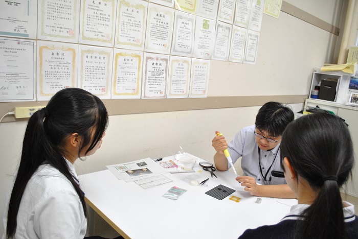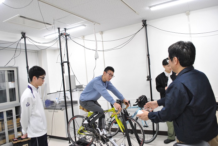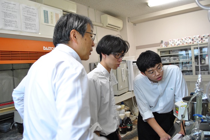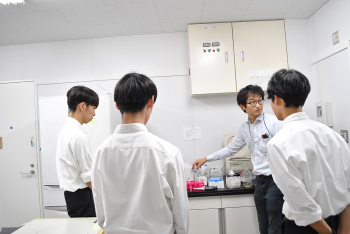 本訪問は、自らが進める課題研究について、大学教員より指導や助言を受けたいとの要望があり実施されたもので、生徒さんが取り組む課題は全10テーマ。各テーマごとに研究室を訪れ、助言を受けたり検証のための実験を体験したりと、自身の課題解決を目指し熱心に取り組んでおりました。